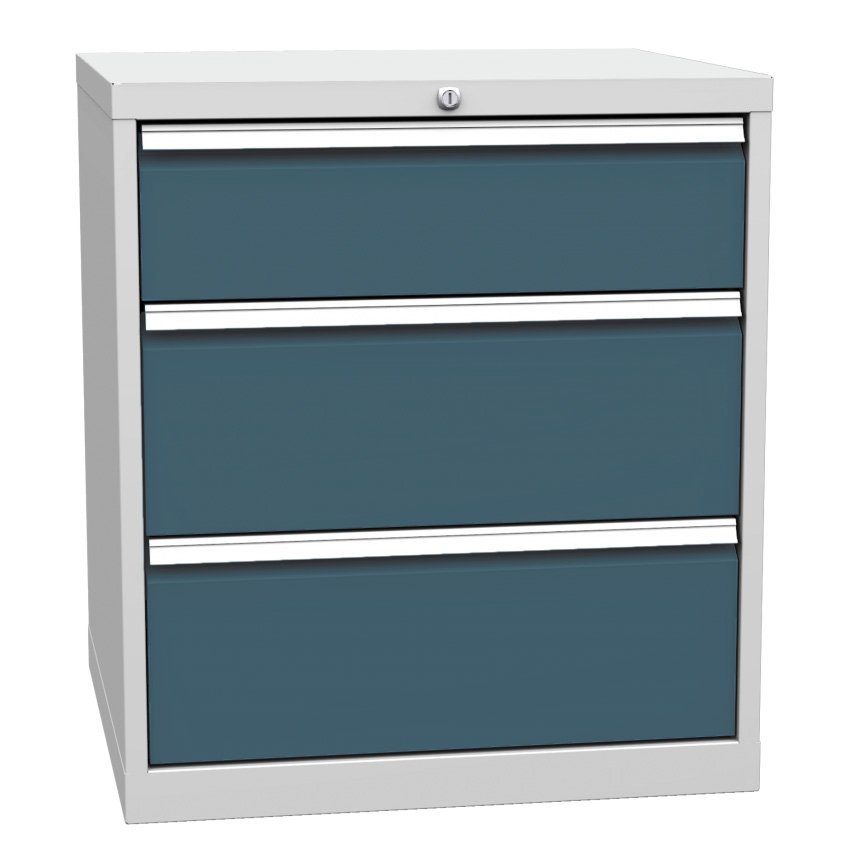 Pojemnik warsztatowy z trzema szufladami, szerokość 500, wysokość 810, głębokość 700 mm. 1x nasadka 180, 2x 240 mm. Kolor korpusu RAL 7035 jasnoszary. Na stanie w kolorze korpusu jasnoszarym, szuflady w kolorze niebieskim.