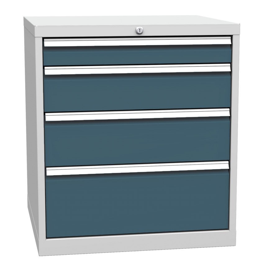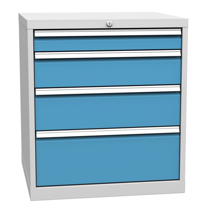 Pojemnik warsztatowy z czterema szufladami, szerokość 720, wysokość 810, głębokość 700 mm. 1x szuflada 90, 1x 150, 1x 180, 1x 240 mm. Kolor korpusu RAL 7035 jasnoszary.