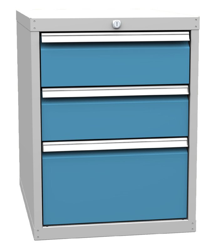 Kontener trzyszufladowy DPP 02A, szerokość 500, wysokość 660, głębokość 700 mm. 2x nasadka 150, 1x 240 mm. Kolor korpusu RAL 7035 jasnoszary.