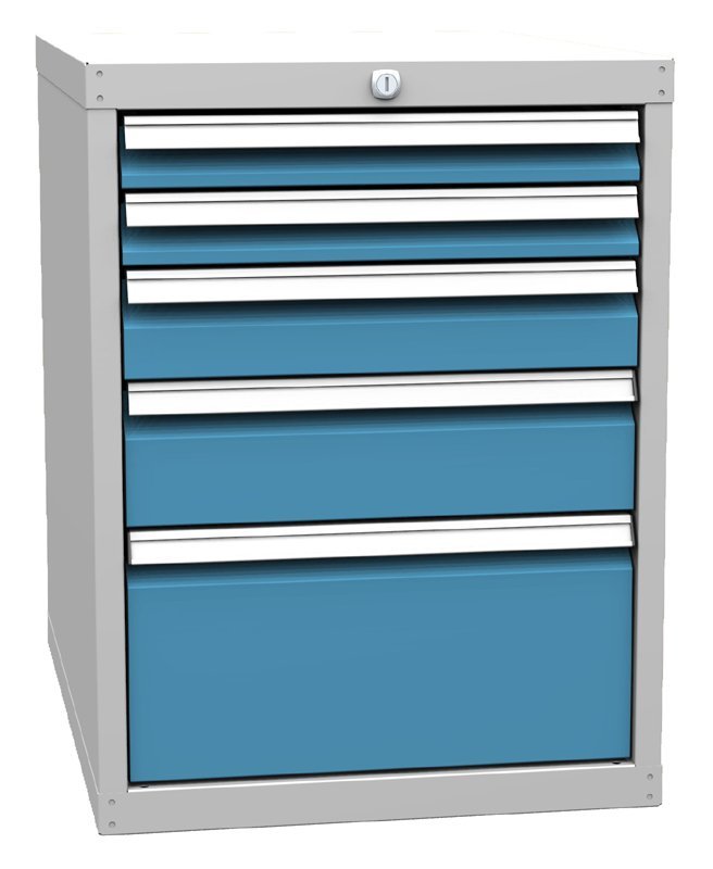 Kontener pięcioszufladowy DPP 02C, szerokość 500, wysokość 660, głębokość 700 mm. 2x nasadka 60, 1x 90, 1x 120, 1x 210 mm. Kolor korpusu RAL 7035 jasnoszary.