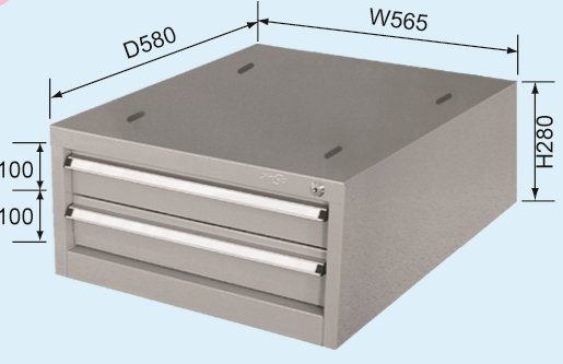 Pojemnik wiszący z dwiema szufladami na stół roboczy, wysokość 280, szerokość 565, głębokość 580 mm. 2x szuflada, kolor korpusu RAL 7035, kolor szuflady RAL 5015.