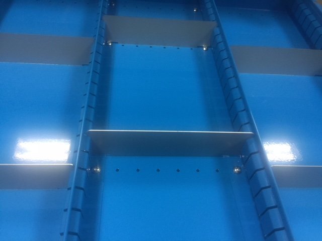 Wiszący pojemnik na stół roboczy, wysokość 450, szerokość 565, głębokość 580 mm. Kolor korpusu RAL 7035, kolor drzwi RAL 5015.
