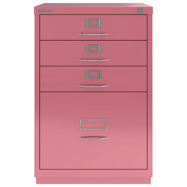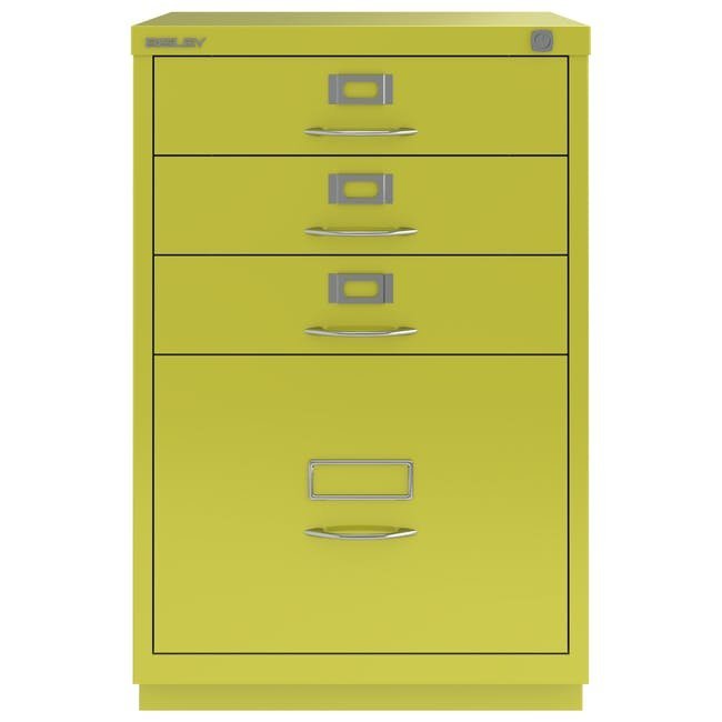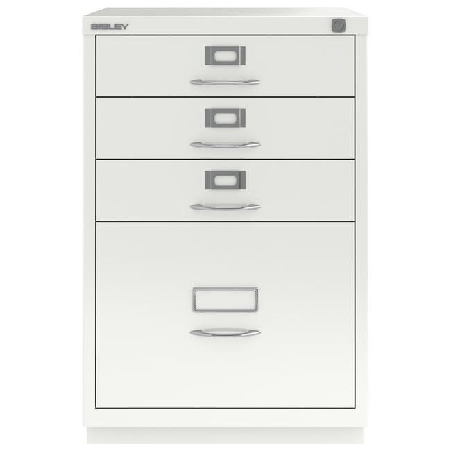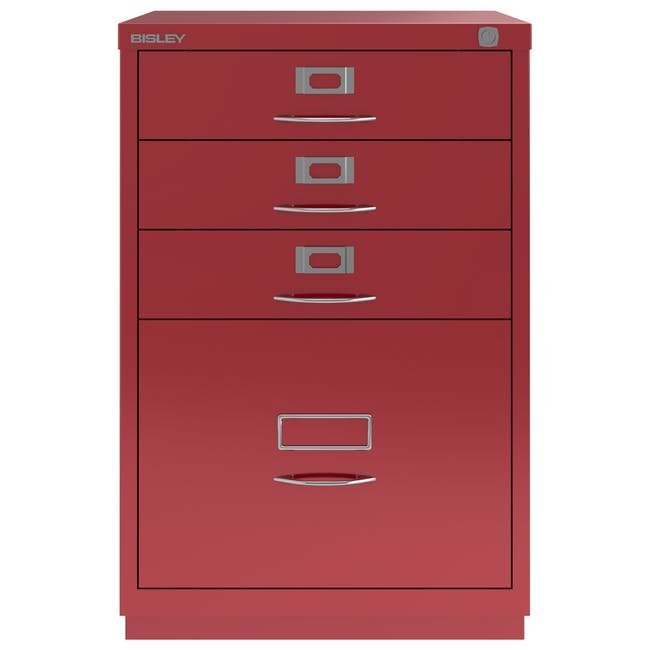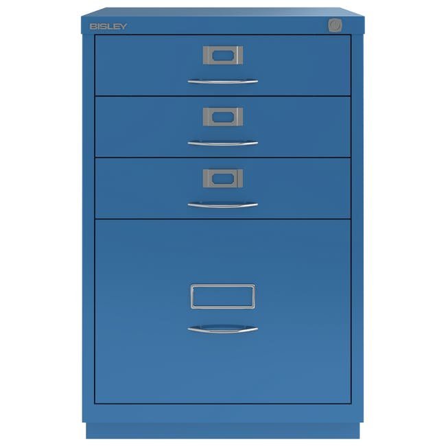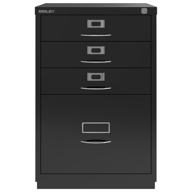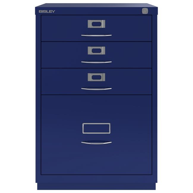 Metalowa szafka na dokumenty Bisley 1F3E z czterema szufladami, szerokość 470, wysokość 711, głębokość 470 mm, różne kolory, klasyczne chromowane uchwyty. Wysoka szuflada wyposażona jest w wyjmowaną listwę redukcyjną do zawieszania kieszeni formatu A4.