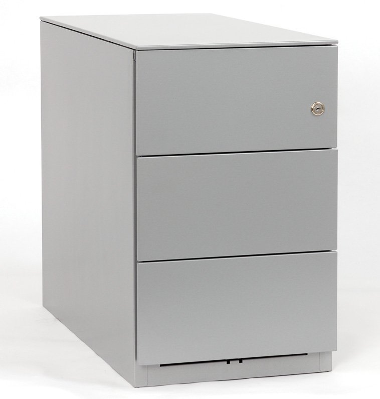Przenośny wąski kontener biurowy, centralny zamek, 2x szuflady na segregatory. Wysokość 645 lub 651, szerokość 300, głębokość 565 mm. Kontener posiada przeciwwagę zabezpieczającą przed przewróceniem się pojemnika przy wysuniętej górnej szufladzie. Wariant bez płyty górnej lub z górną płytą dekoracyjną o grubości 6 mm. Wysuw szuflady 100%.