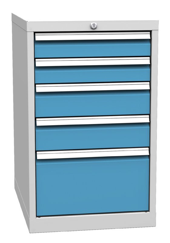 Kontenerek warsztatowy z pięcioma szufladami, szerokość 500, wysokość 810, głębokość 700 mm. 2x nasadka 90, 2x 120, 1x 240 mm. Kolor korpusu RAL 7035 jasnoszary. Dostępny w kolorze korpusu jasnoszarym, szuflady w kolorze niebieskim.