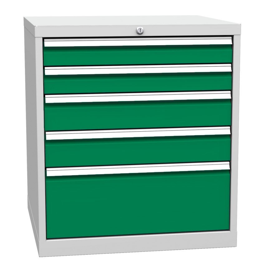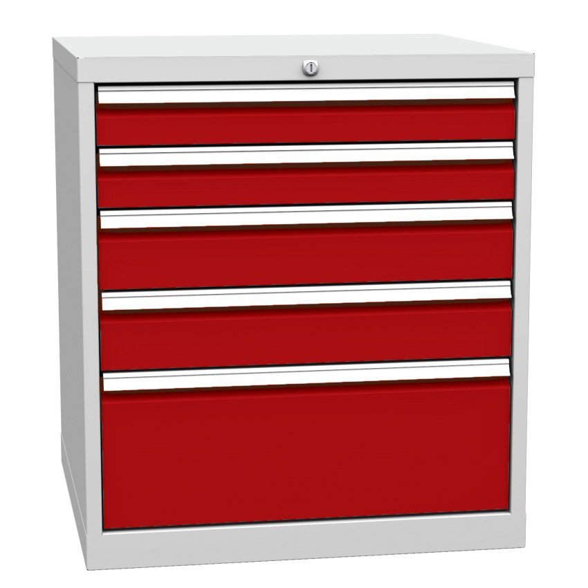 Kontener warsztatowy z pięcioma szufladami, szerokość 720, wysokość 810, głębokość 700 mm. 1x nasadka 60, 2x 90, 2x 120, 1x 180 mm. Kolor korpusu RAL 7035 jasnoszary.