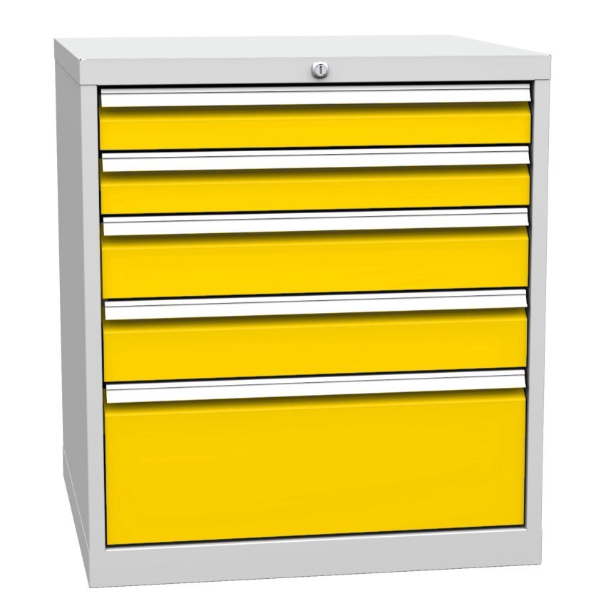 Kontenerek warsztatowy z pięcioma szufladami, szerokość 500, wysokość 810, głębokość 700 mm. 2x nasadka 90, 2x 120, 1x 240 mm. Kolor korpusu RAL 7035 jasnoszary. Dostępny w kolorze korpusu jasnoszarym, szuflady w kolorze niebieskim.