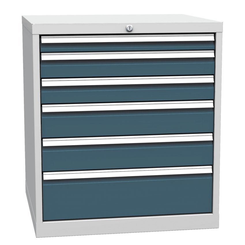 Kontenerek z sześcioma szufladami Workbench, szerokość 1000, wysokość 810, głębokość 700 mm. 1x nasadka 60, 2x 90, 2x 120, 1x 180 mm. Kolor korpusu RAL 7035 jasnoszary.