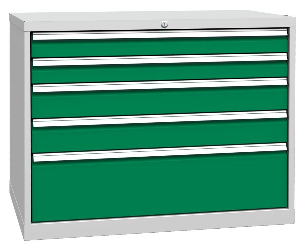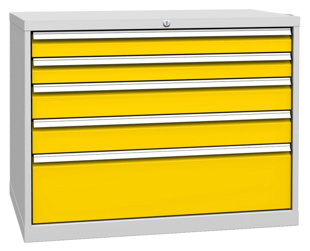 Pojemnik warsztatowy z czterema szufladami, szerokość 1000, wysokość 810, głębokość 700 mm. 1x szuflada 90, 1x 150, 1x 180, 1x 240 mm. Kolor korpusu RAL 7035 jasnoszary.