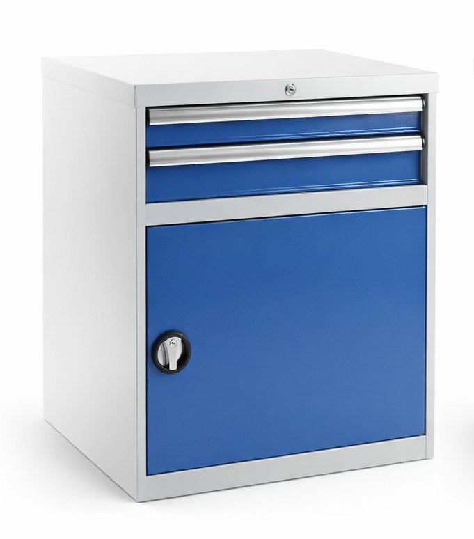 Dwuszufladowy kontener stołu roboczego z drzwiami, szerokość 717 mm, wysokość 800 mm, głębokość 727 mm, 1× szuflada 75 mm, 1× 100 mm, 1× półka. Kolor korpusu RAL 7035 jasnoszary, kolor szuflad RAL 5012 niebieski.