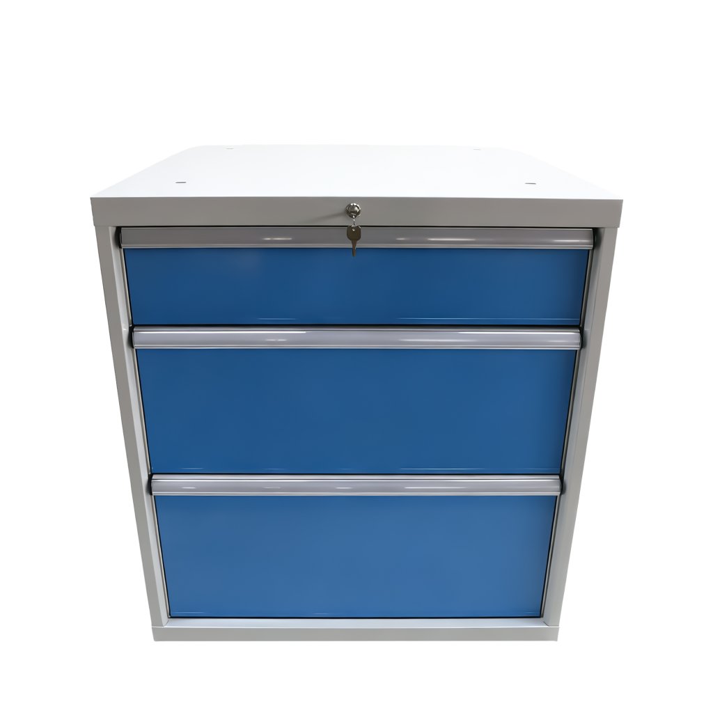 Trzyszufladowy kontener stołu roboczego, szerokość 717 mm, wysokość 800 mm, głębokość 727 mm, 1× szuflada 150 mm, 1× 250 mm, 1× 300 mm. Kolor korpusu RAL 7035 jasnoszary, kolor szuflad RAL 5012 niebieski.