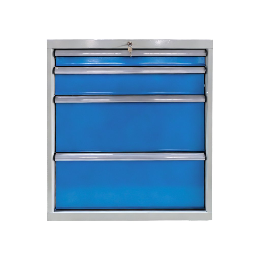Kontenerek warsztatowy z czterema szufladami, szerokość 500, wysokość 810, głębokość 700 mm. 1x szuflada 90, 1x 150, 1x 180, 1x 240 mm. Kolor korpusu ESD: jasnoszary RAL 7035, kolor szuflady: niebieski RAL 5012.