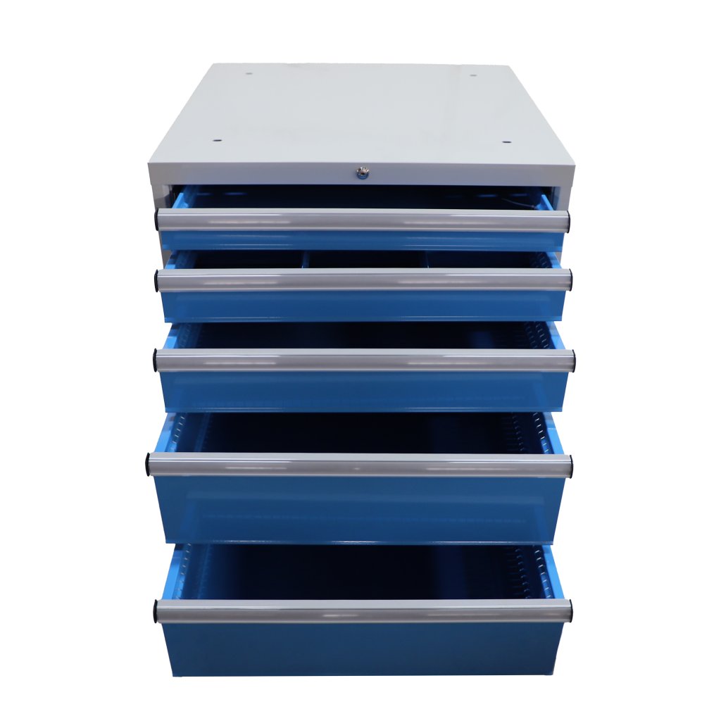 Pięcioszufladowy kontener stołu roboczego, szerokość 717 mm, wysokość 800 mm, głębokość 727 mm, 1× szuflada 75 mm, 1× 100, 1x 125, 2× 200 mm. Kolor korpusu RAL 7035 jasnoszary, kolor szuflad RAL 5012 niebieski.