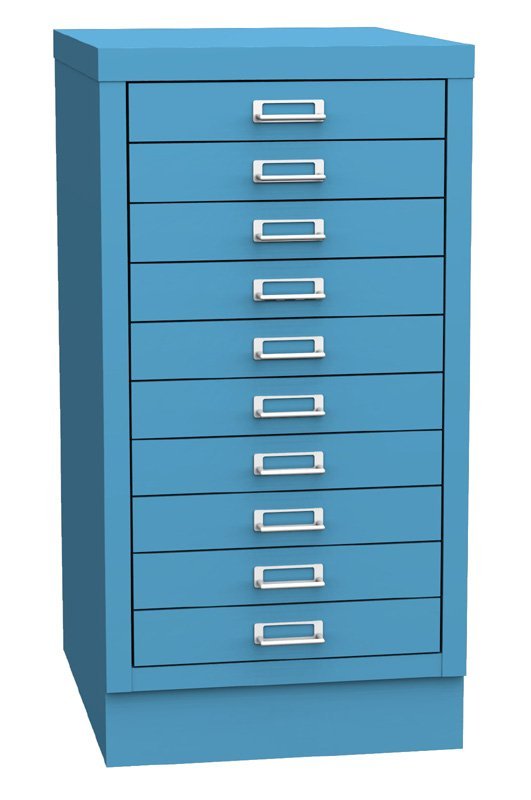 Szafa metalowa (do formatu A3) z 10 szufladami, szerokość 349, wysokość 670, głębokość 432 mm. W komplecie cokół w kolorze czarnym lub na zamówienie w kolorze szafki.
