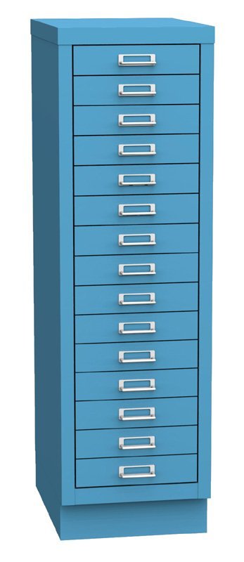 Szafka metalowa (format A3) z 15 szufladami, szerokość 349, wysokość 940, głębokość 432 mm. W komplecie cokół w kolorze czarnym lub na zamówienie w kolorze szafki.
