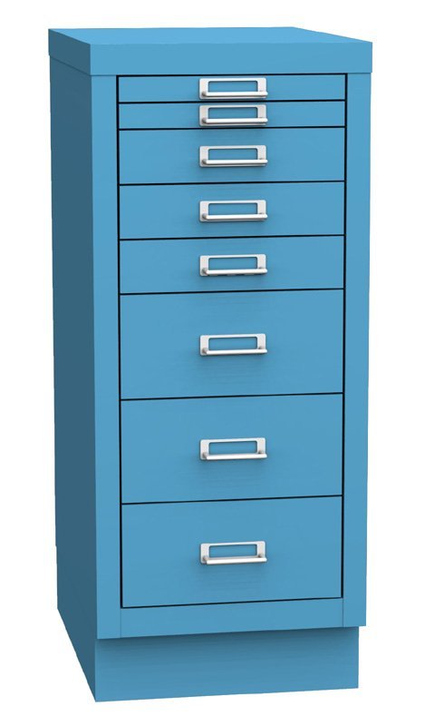 Szafka metalowa (do formatu A3) z dziewięcioma szufladami, szerokość 349, wysokość 940, głębokość 432 mm. W komplecie cokół w kolorze czarnym lub na zamówienie w kolorze szafki.