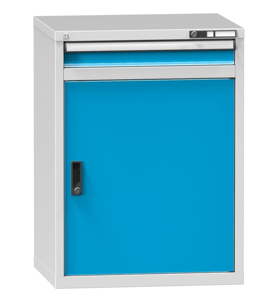 Szafka z szufladami, 1x szuflada, 1x drzwi + 2x półki regulowane, wysokość 990, szerokość 731, głębokość 630 mm. Wymiary wewnętrzne szuflady 612 x 459 mm.
