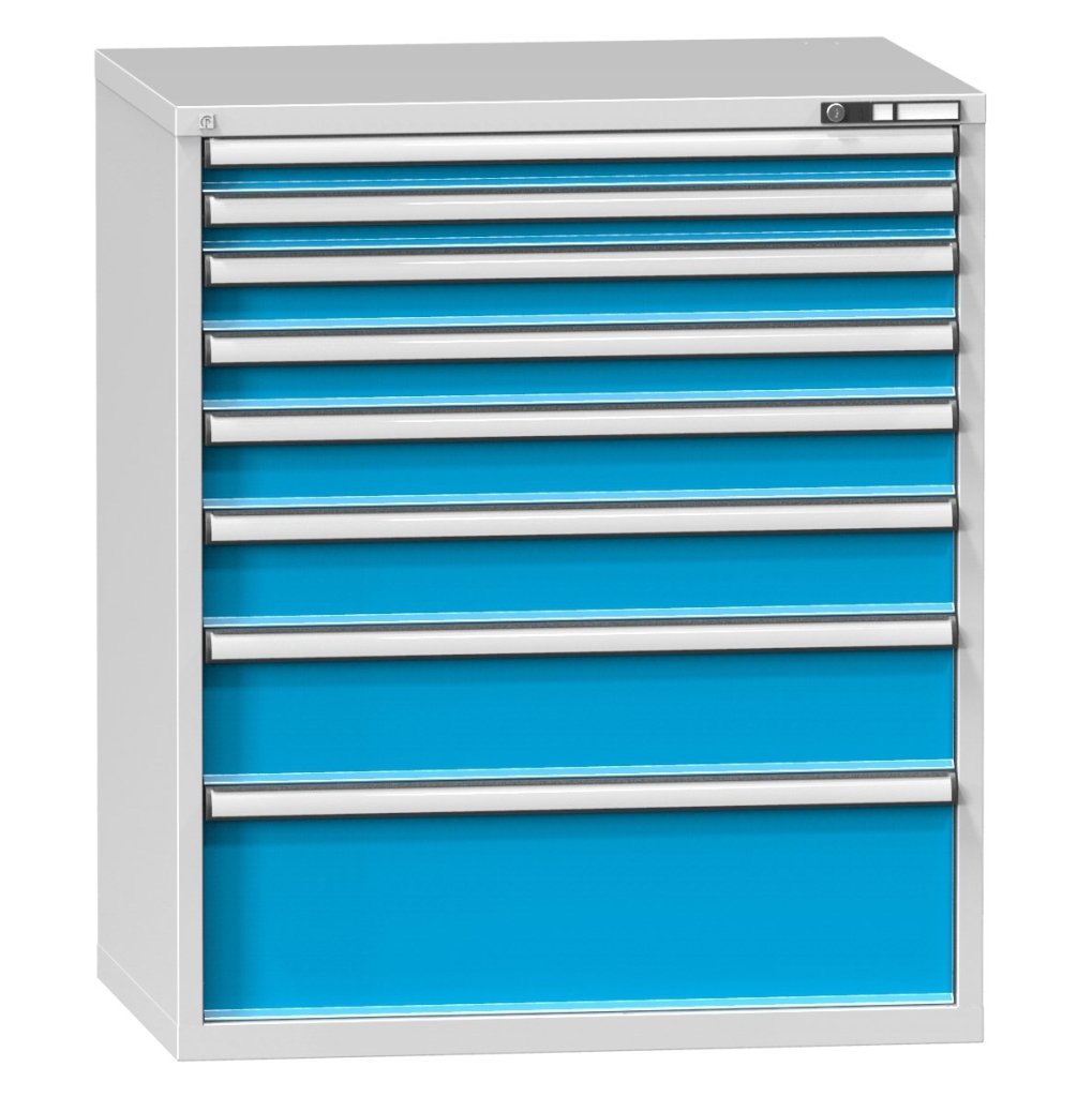 Szafka z szufladami, 9 szuflad, wysokość 1215, szerokość 1037, głębokość 780 mm. Wymiary wewnętrzne szuflady 918 x 612 mm.