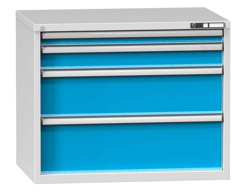 Szafka z szufladami, 4 szuflady, wysokość 840, szerokość 1037, głębokość 780 mm. Zastosowanie w zestawach stołowych o głębokości blatu 800 mm. Wymiary wewnętrzne szuflady 918 x 612 mm.