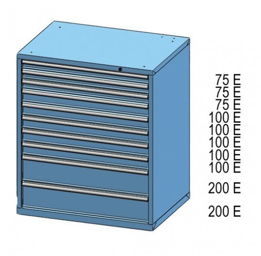 Szafka z szufladami, 9 szuflad, wysokość 1215, szerokość 1037, głębokość 780 mm. Wymiary wewnętrzne szuflady 918 x 612 mm.