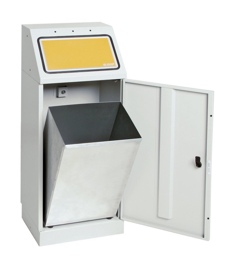 Pojemnik do segregacji odpadów, metalowy, o wymiarach - wysokość 920 x szerokość 580 x głębokość 380 mm. Cała konstrukcja posiada powierzchnię ocynkowaną. Zamknięcie posiada solidne osłony w 3 kolorach dla wyróżnienia. Klapa jest samozamykająca i odporna na zapachy. Kosz posiada zamykane drzwiczki z przodu oraz wyjmowany kosz wewnętrzny 3x 30 l. Dwie regulowane nóżki umożliwiające wyrównanie nierówności podłoża.