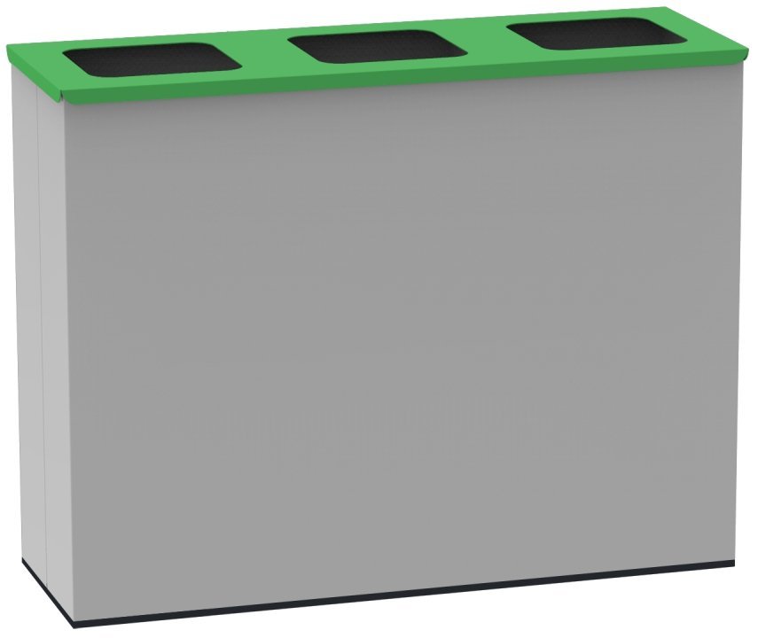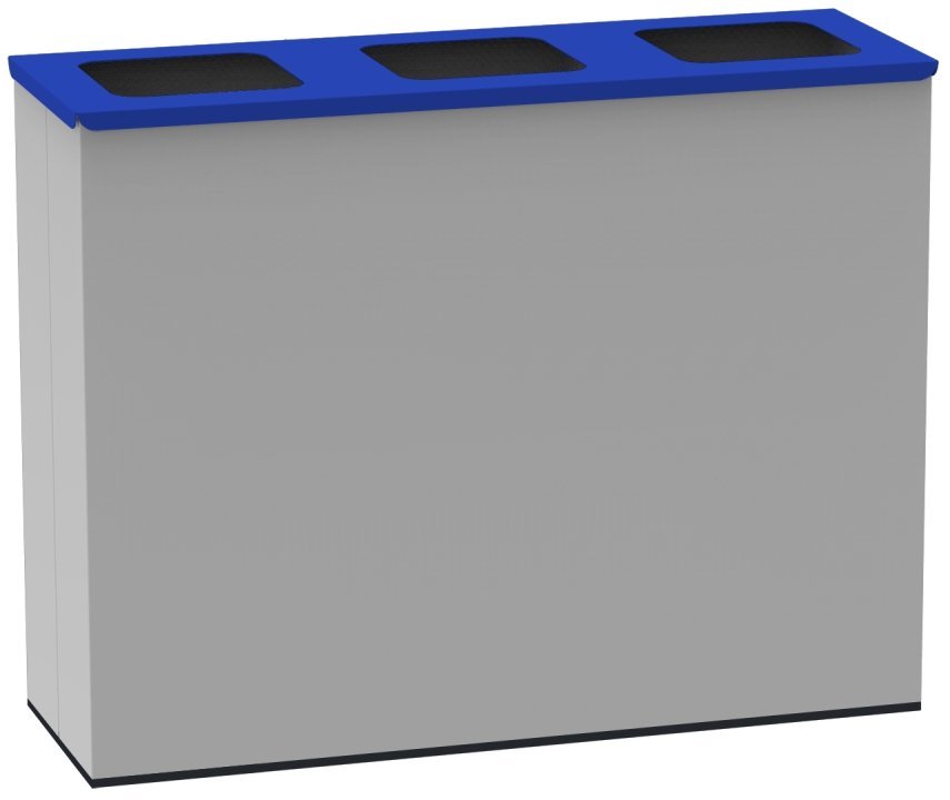 Do segregacji odpadów. Wysokość 760 x szerokość 910 x głębokość 320 mm. Kolor kosza jasnoszary RAL 7035, różne kolory pokrywy. Tylko do użytku wewnętrznego.