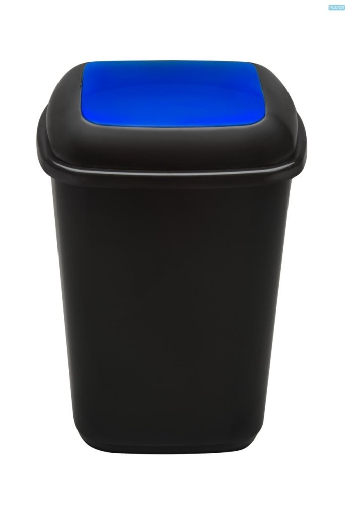 Nowoczesny kosz na śmieci plastikowy o pojemności 45 l, wykonany z czarnego tworzywa sztucznego na odpady sortowane, z niebieską klapką w pokrywie. Pokrywa ze sprężyną jest zdejmowana. Kosz jest oznaczony naklejką (można ją odkleić).