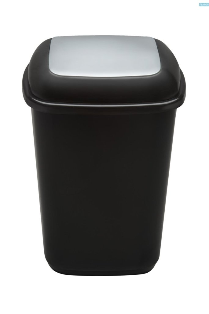 Nowoczesny kosz na śmieci plastikowy o pojemności 45 litrów, wykonany z czarnego tworzywa sztucznego na odpady sortowane, ze srebrną klapką w pokrywie. Pokrywa ze sprężyną jest zdejmowana. Kosz jest oznaczony naklejką (można ją odkleić).