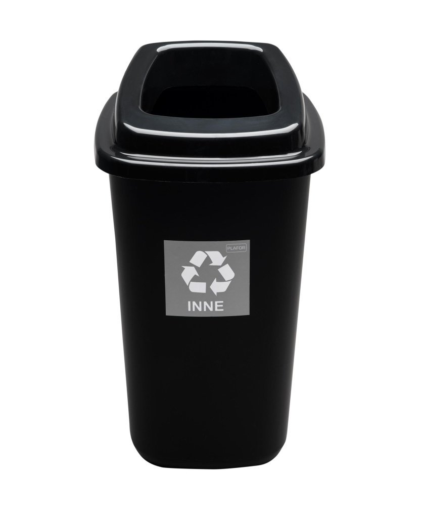 Plastikowy kosz na śmieci o pojemności 45 l wykonany z czarnego tworzywa sztucznego na odpady sortowane z czarną pokrywą. Pokrywa z otworem do usuwania śmieci jest zdejmowana. Kosz oznaczony naklejką.