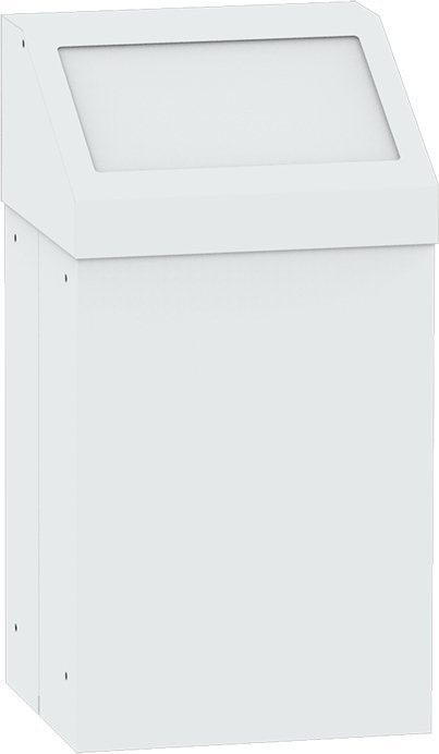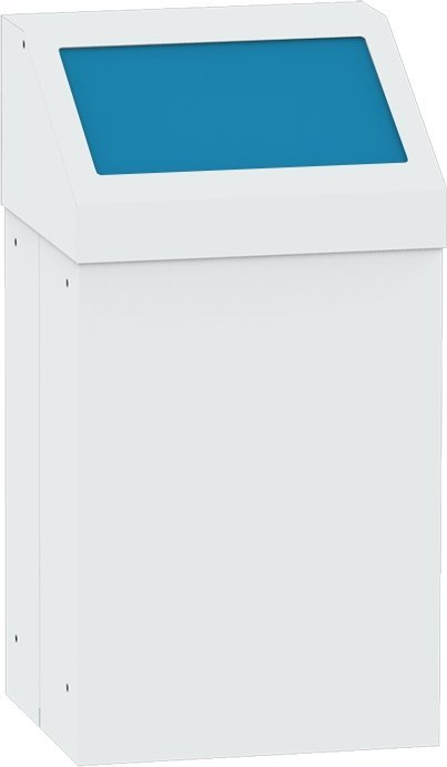 Metalowy kosz na śmieci ze zdejmowaną pokrywą, odpowiedni do sortowanych odpadów. Wysokość 740 x szerokość 300 x głębokość 250 mm, pojemność 45 l. Kolor kosza i pokrywy jasnoszary RAL 7035, różne kolory klap w pokrywie w celu rozróżnienia rodzaju odpadów. Tylko do użytku wewnętrznego.