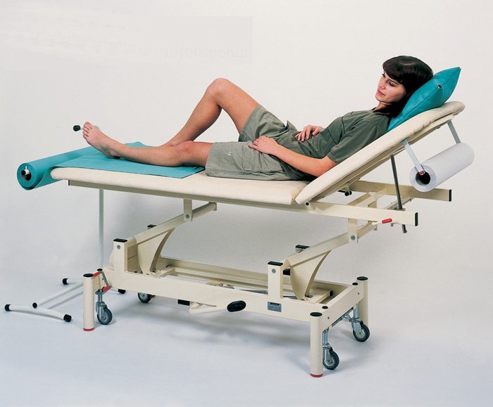 Elektrycznie regulowana kozetka - zakres nastawienia wysokości 45 - 90 cm, długość 195 cm, szerokość 68 cm, nośność 150 kg. Pozycjonowana część tylna 64 cm z regulacją od 0° do 60°, skrzynka wyłączników bezpieczeństwa. Sterowanie ręczne lub nożne.
