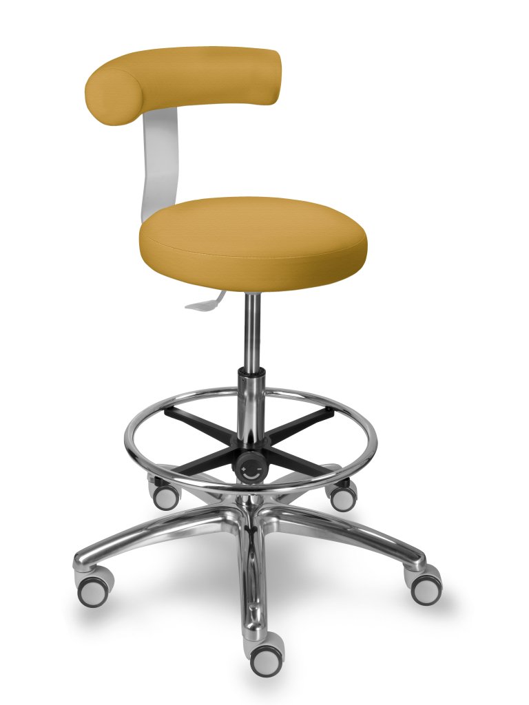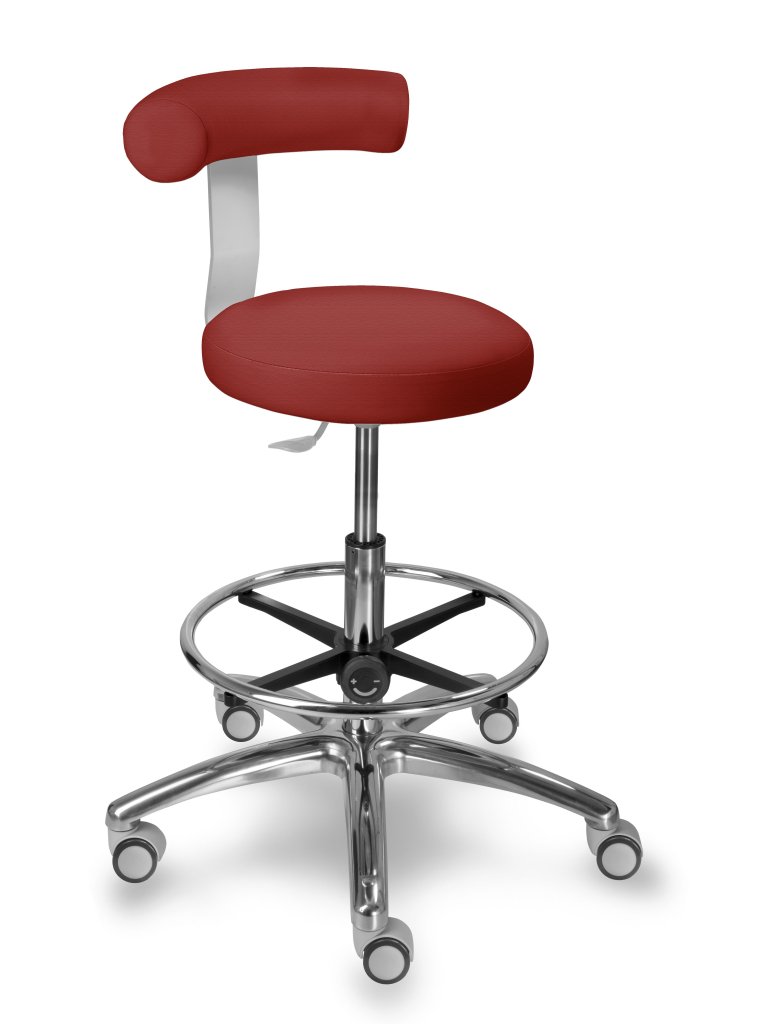 Obrotowe krzesło dentystyczne z oparciem i podnóżkiem, krzyż z polerowanego aluminium, kolor ramy jasnoszary RAL 7035, tapicerka z tkaniny, nadającej się do prania sztucznej skóry lub skóry.