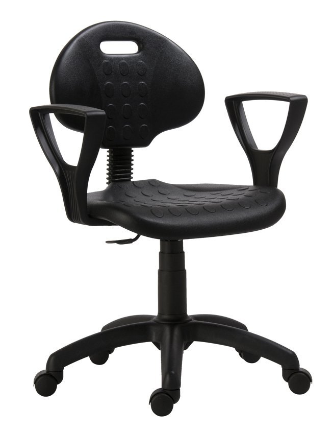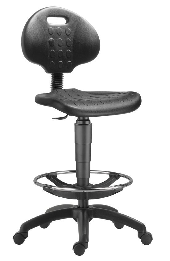Krzesło warsztatowe z poliuretanu, regulowany kąt oparcia, regulowana wysokość oparcia i głębokość siedziska, tłok gazowy. Kółka lub ślizgacze, możliwość podwyższonego siedziska z okrągłym podnóżkiem. Krzyż plastikowy lub chromowany. Cena bez podłokietników.