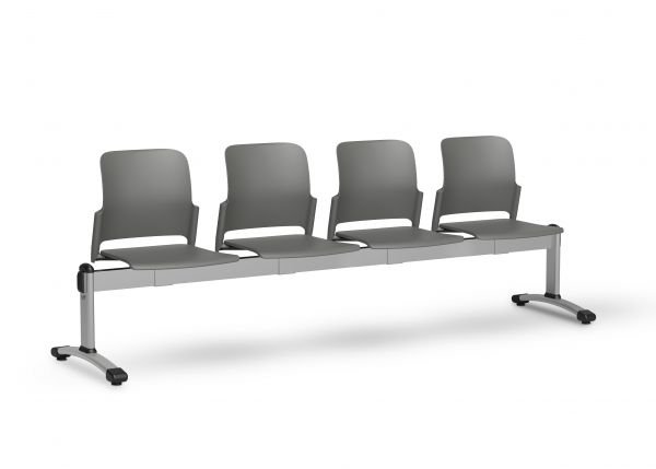 Ławka czteroosobowa Mayer Class 42C4. Idealna do poczekalni. Różne kolory tworzywa sztucznego, rama czarna, chromowana lub srebrna perła. Cena bez podłokietników. Siedzisko można zastąpić czarnym stolikiem bocznym.
