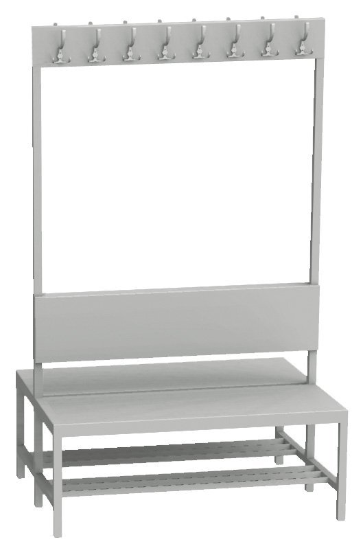 Ławka szatniowa z oparciem i wieszakiem 1000 mm dwustronna. Wysokość 1800, szerokość 1000, głębokość 830 mm, 16 wieszaków (8 x 2). Kolor jasnoszary RAL 7035.