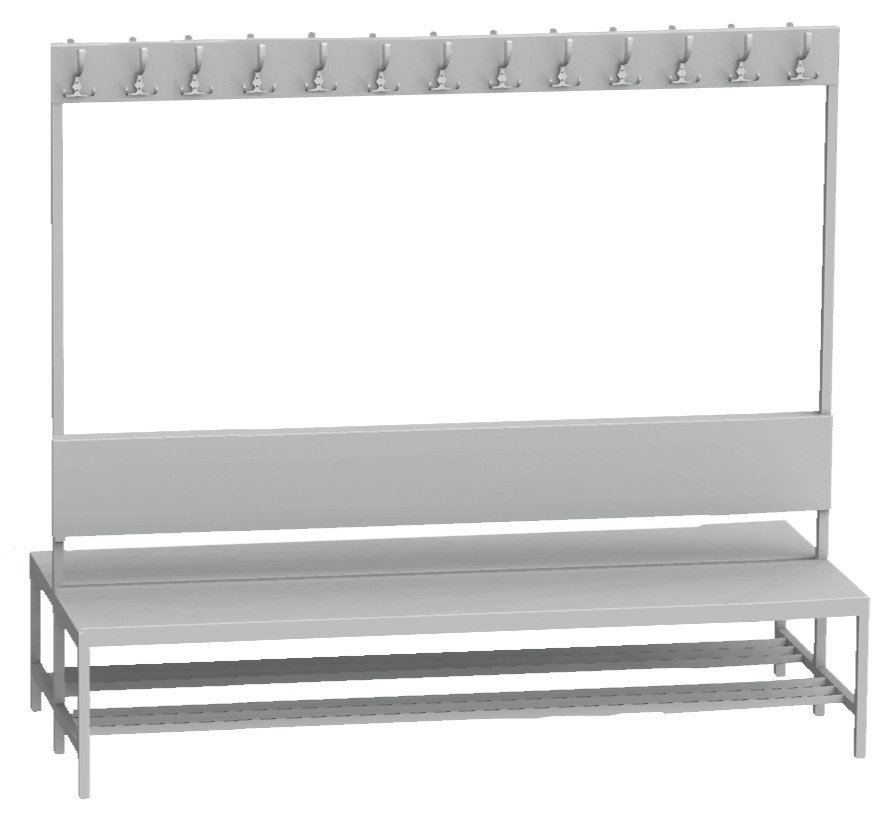 Ławka szatniowa z oparciem i wieszakiem 1500 mm dwustronna. Wysokość 1800, szerokość 1500, głębokość 830 mm, 22 wieszaki (11 x 2). Kolor jasnoszary RAL 7035.