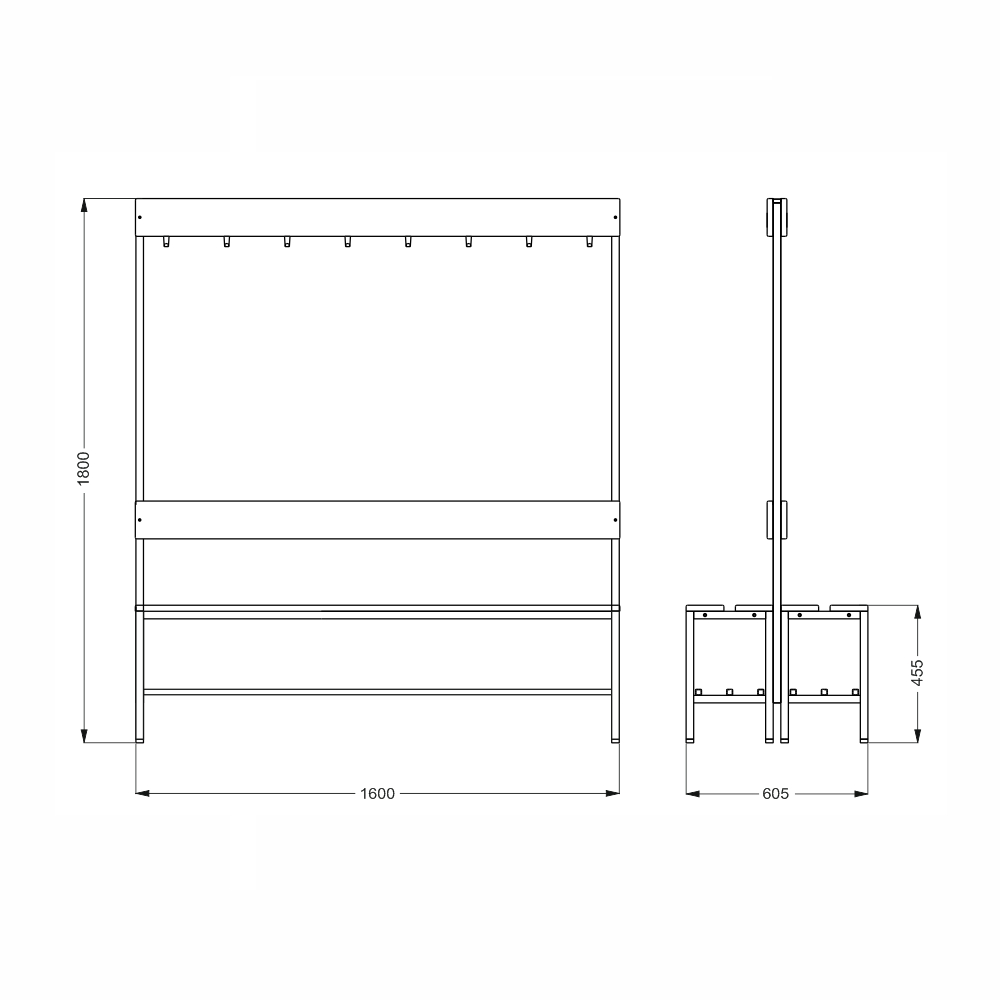 Ławka szatniowa z wieszakiem, dwustronna, szerokość 1600 mm.