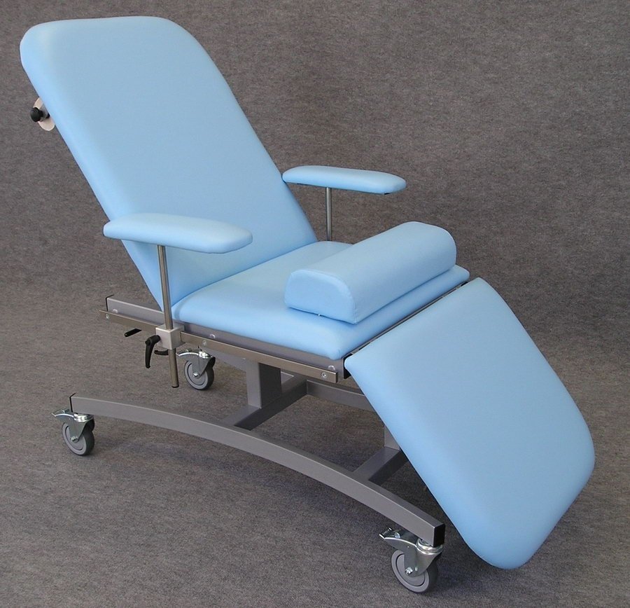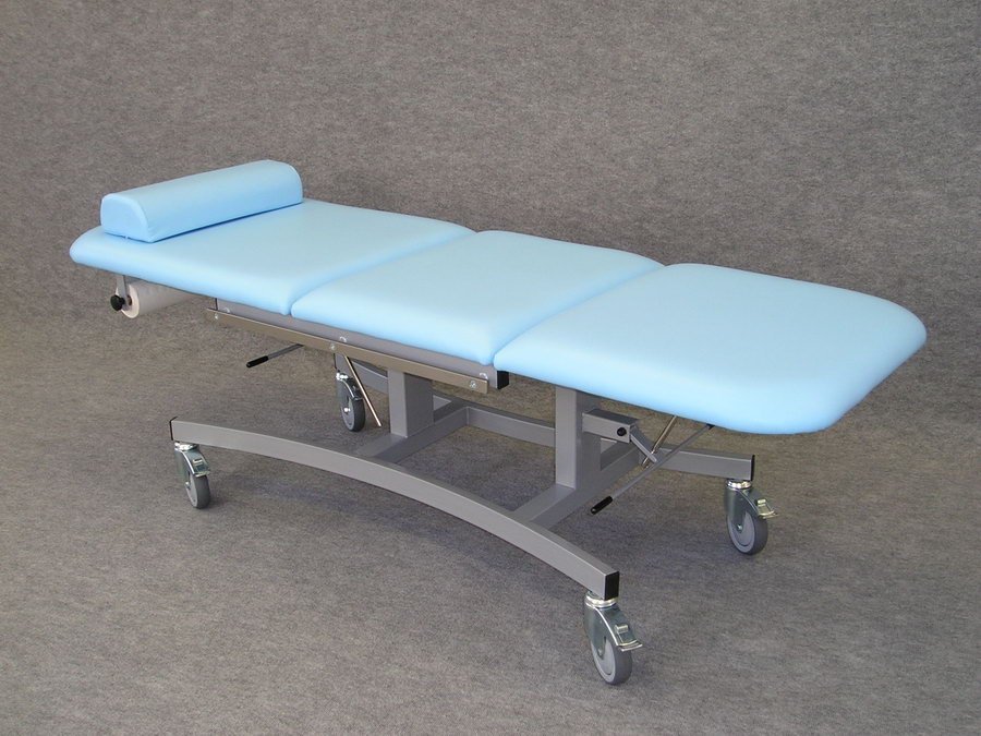 Mobilna kozetka do badań. Wysokość zagłówka można płynnie regulować za pomocą mechanizmu podnoszącego. Metalowe części stołu zostały poddane obróbce powierzchniowej technologią proszkową. Część łóżka wykonana jest ze skóry ekologicznej, którą można prać. Możliwość dostawy z uchwytem na papier. Pozycjonowanie zagłówka.