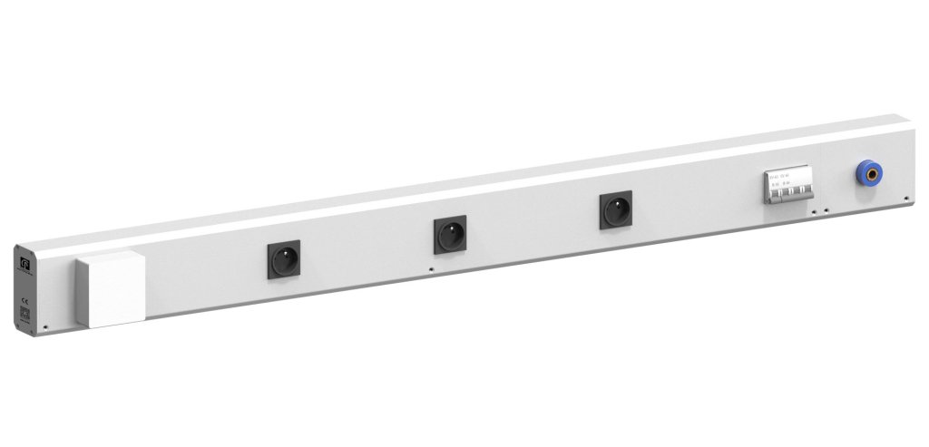 Listwa zasilająca, 3x gniazdo 230V / 16A, 1x wyłącznik 230V / 16A, 1x gniazdo 400V / 16A, 1x wyłącznik 400V / 16A, dostarczana bez kabla zasilającego (400V / max. 20A) i węża pneumatycznego, z szybkozłączem pneumatycznym sprzęganie. Szerokość 1414 x wysokość 123 x głębokość 66 mm.