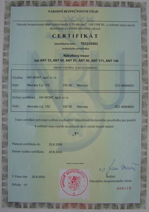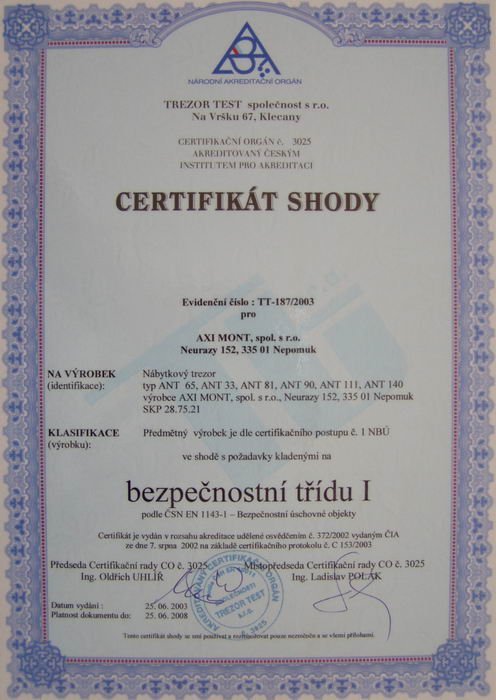 Sejf meblowy ANT 81 posiada certyfikat zgodnie z normą ČSN 1143-1 wydany przez akredytowaną jednostkę certyfikującą TREZOR TEST s pełny opis i parametry