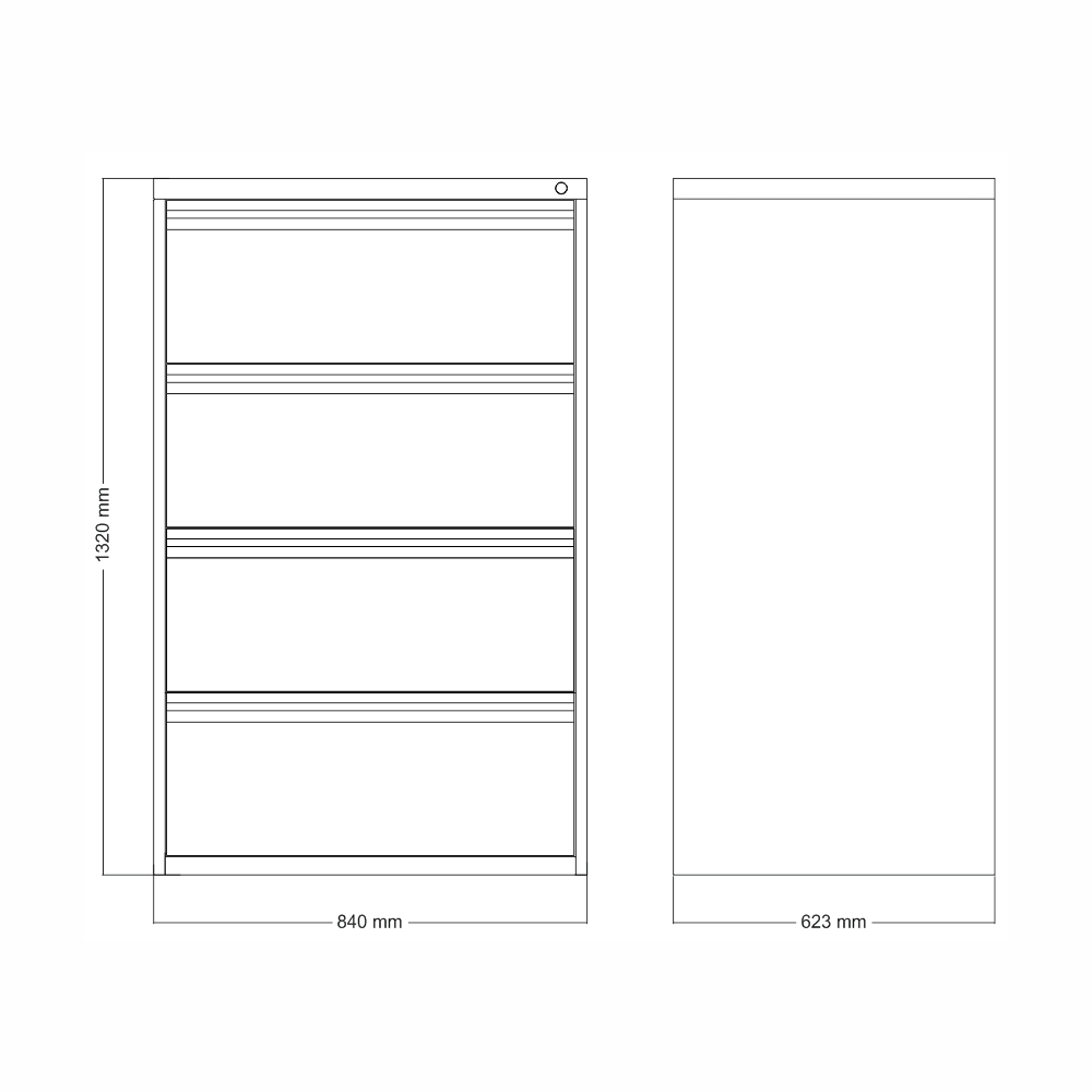 Metalowa kartoteka z czterema szufladami mieszcząca dwa rzędy w formacie A4 obok siebie w każdej szufladzie. Wysokość 1320 x szerokość 840 x głębokość 623 mm. Pełny wysuw szuflad na prowadnicy kulkowej. Inne kolory na zamówienie.