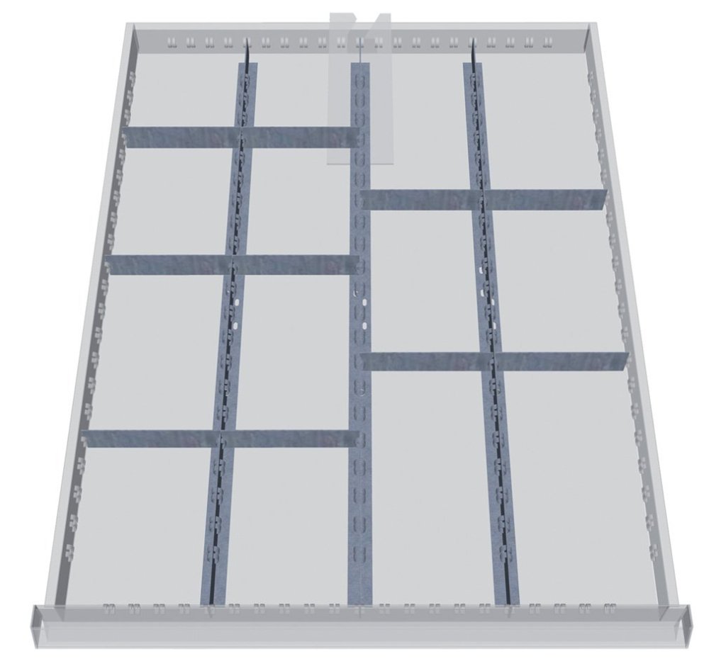 Zestaw plastikowych przegródek do szuflad o wysokości 50 - 75 mm. Pasuje wyłącznie do szafek z szufladami Bedrunka+Hirth o szerokości 555 i głębokości 736 mm.