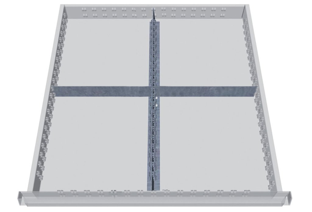 Zestaw plastikowych przegródek do szuflad o wysokości 50 - 75 mm. Pasuje wyłącznie do szafek z szufladami Bedrunka+Hirth o szerokości 705 i głębokości 736 mm.