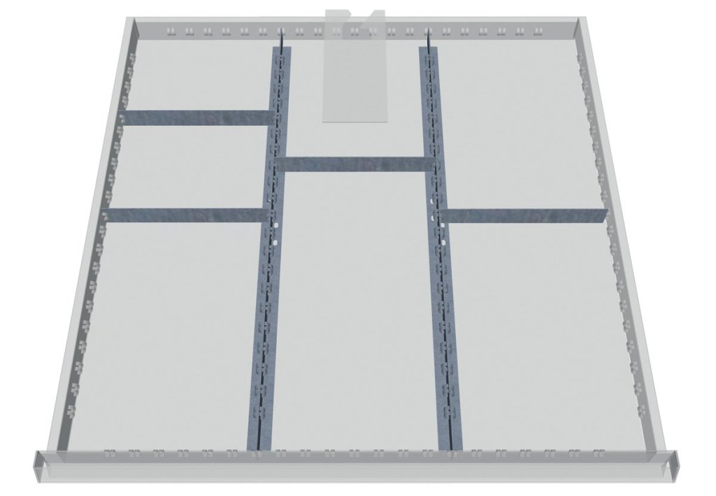 Zestaw plastikowych przegródek do szuflad o wysokości 50 - 75 mm. Pasuje wyłącznie do szafek z szufladami Bedrunka+Hirth o szerokości 705 i głębokości 736 mm.