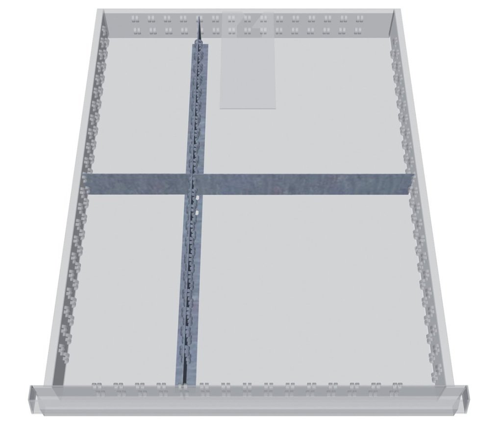 Zestaw plastikowych przegródek do szuflad o wysokości 50 - 75 mm. Pasuje wyłącznie do szafek z szufladami Bedrunka+Hirth o szerokości 555 i głębokości 736 mm.