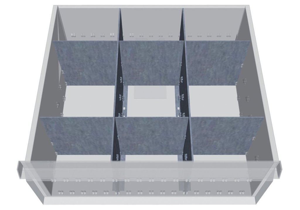 Zestaw plastikowych przegródek do szuflad o wysokości 50 - 75 mm. Pasuje wyłącznie do szafek z szufladami Bedrunka+Hirth o szerokości 555 i głębokości 736 mm.