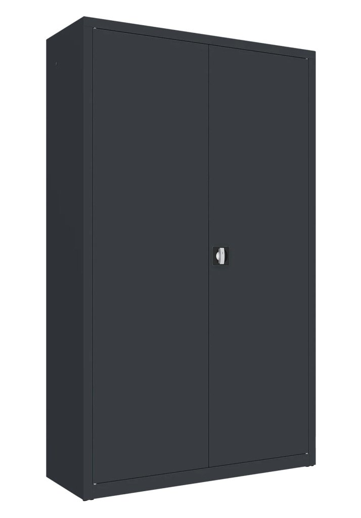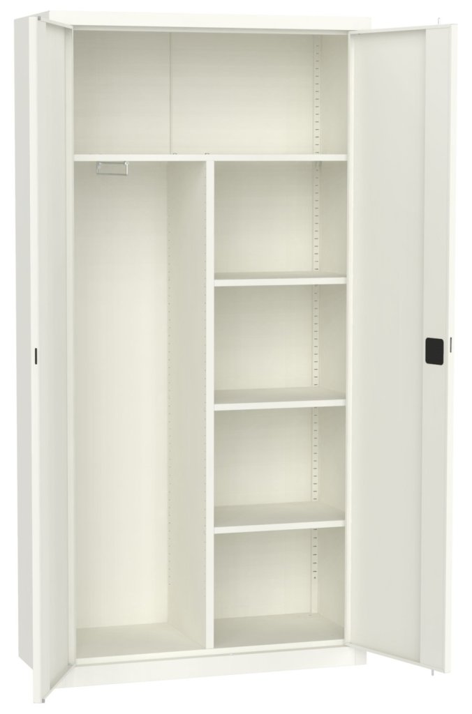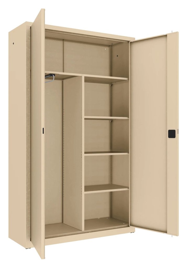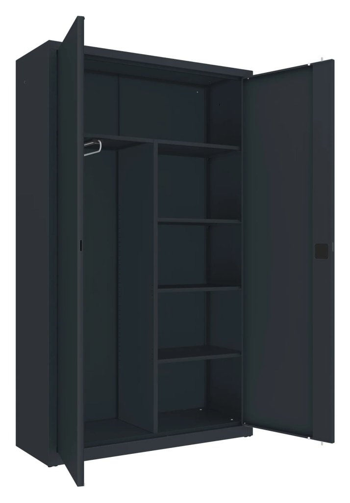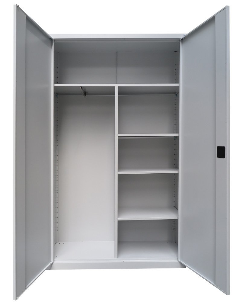 Metalowa szafa aktowa dwudrzwiowa z czterema półkami i przedziałem ubraniowym z wysuwanym drążkiem na wieszaki, szerokość 1200 mm (patrz warianty produktu), wysokość 1990, głębokość 435 mm. Dwupunktowa blokada rozstawu osi, różne kolory.