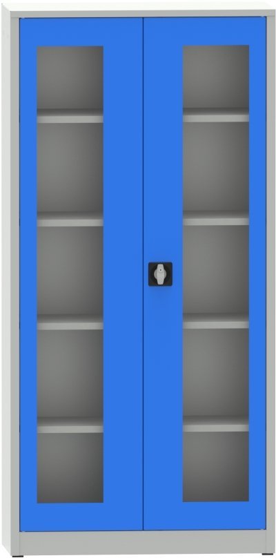 Dwudrzwiowa metalowa szafa spawana z drzwiami szklanymi z plexi, szerokość 950, wysokość 1950, głębokość 600 mm, 4 regulowane półki. Kolor korpusu RAL 7035 jasnoszary, drzwi RAL 7035 jasnoszary i RAL 5012 niebieski.