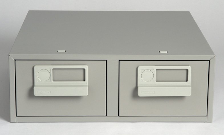 Metalowa szafka dwuszufladowa, na dokumenty w formacie A6, szerokość 434, wysokość 159, głębokość 422 mm, zamek cylindryczny, różne kolory.