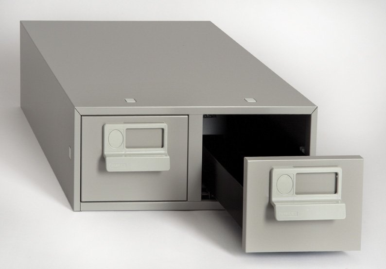 Metalowa szafka, dwuszufladowa, na dokumenty formatu A7, szerokość 384, wysokość 133, głębokość 422 mm, zamek bębenkowy, różne pełny opis i parametry